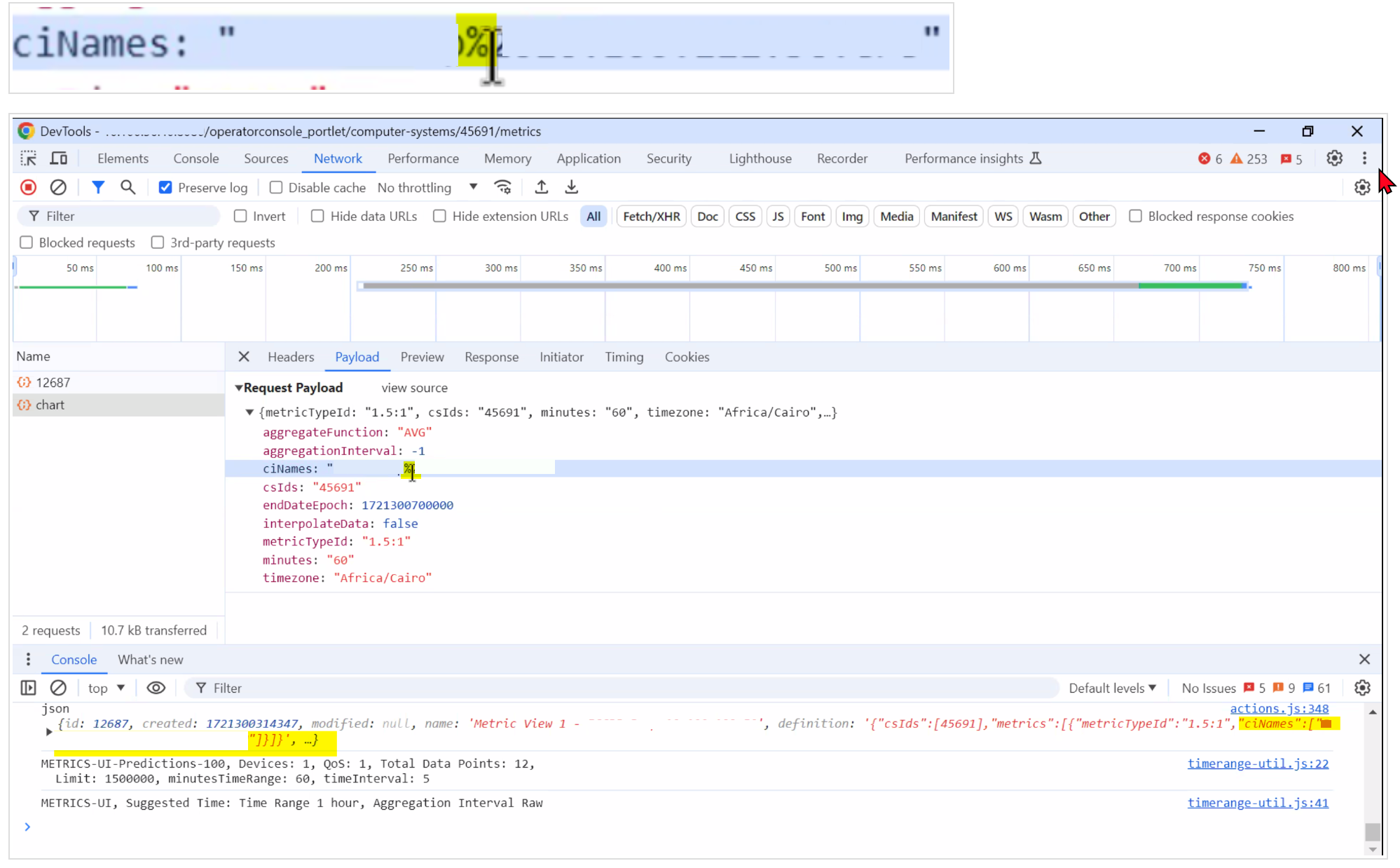 This is evidenced by opening the browser developer tools (via F12) when selecting the metrics, e.g., System->Aggregate CPU etc, and clicking on the dev tools Network tab, Create the view and it renders empty, then inspect the CI name (ciNames).