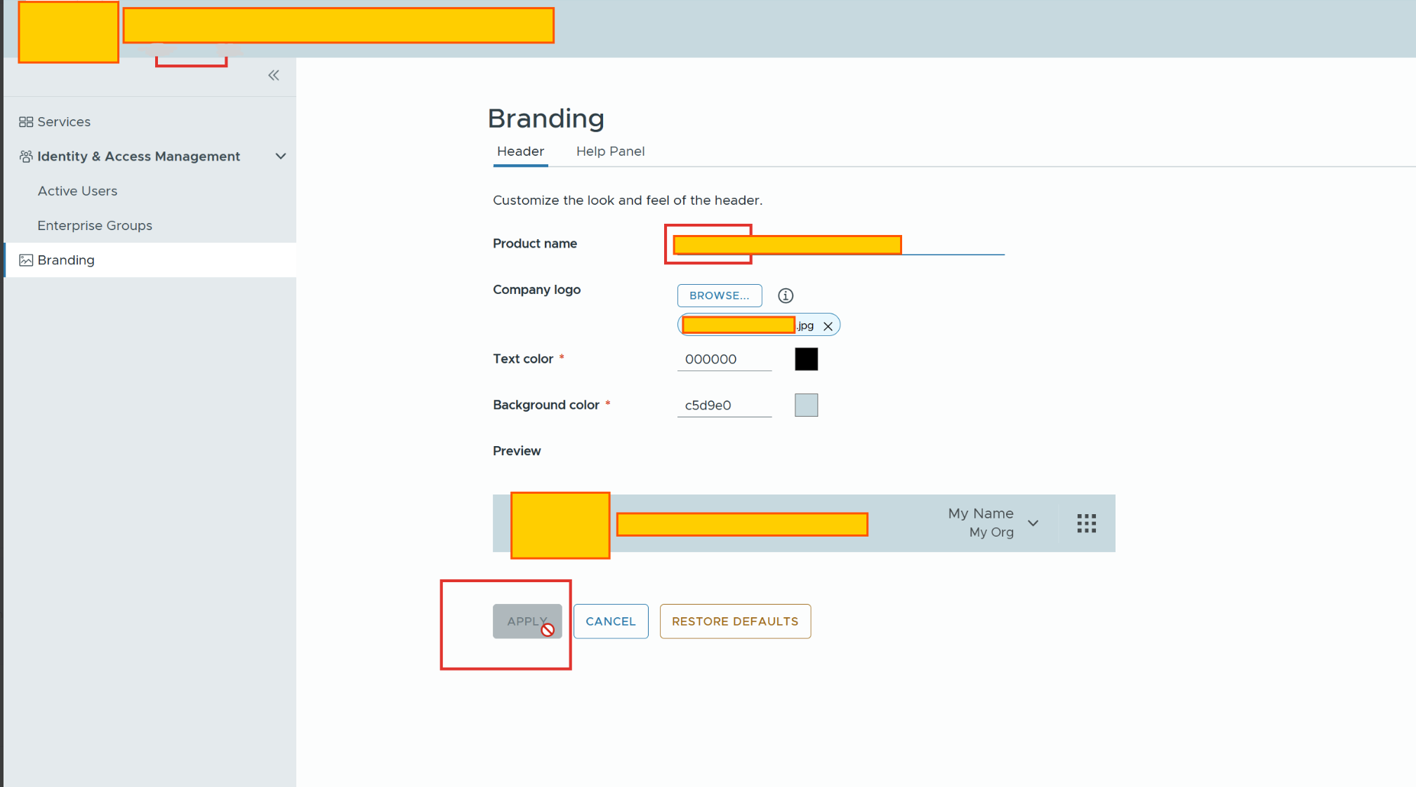 Unable to make Branding Modifications on Aria Automation 8.x due to the Apply button being greyed out.