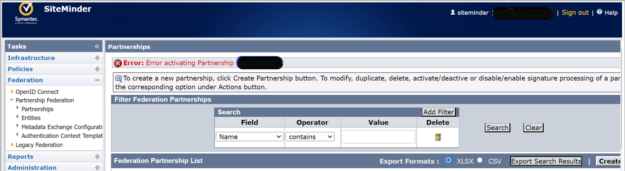 Encountering error while attempting to activate the Federation partnership.