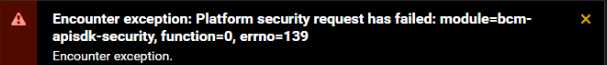 Encounter exception: Platform security request has failed: module=bcm-apisdk-security, function=0, errno=139 Encounter exception.
