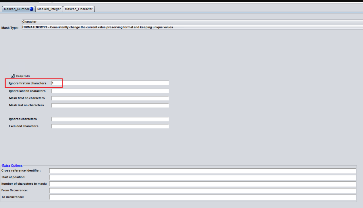 The ZEROREPLACEFORMATENCRYPT options doesn't exist in the FDM UI, so you can't run the masking job from the UI. If you try running the masking job from the FDM UI, when you save the options file to run the job, the options file will be overwritten, removing the ZEROREPLACEFORMATENCRYPT=Y, and resulting in a normal FORMATENCRYPT job, for a Numeric Data Type, and the first digit will be ignored.