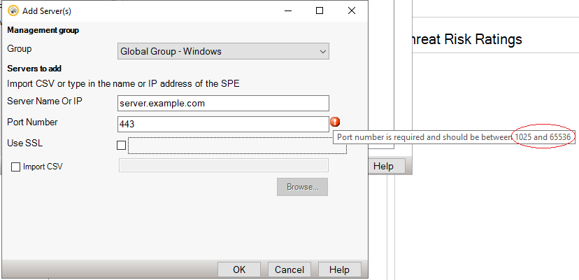 The Protection Engine REST API service, by default, listens on port 8008, but is configurable to listen on any available port. However, when an attempt to add a server to be managed via the SPE Console for Windows, it will only accept port values 1025 - 65536