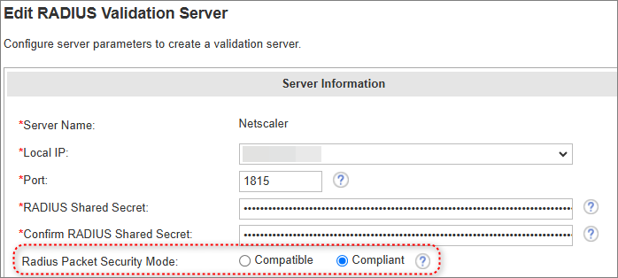 Note: When the Radius Packet Security Mode is in compliant mode then it is expected that your RADIUS clients should have the capability to send the Message-Authenticator attribute as part of the radius request. Consult with your application vendor to determine if this is possible.