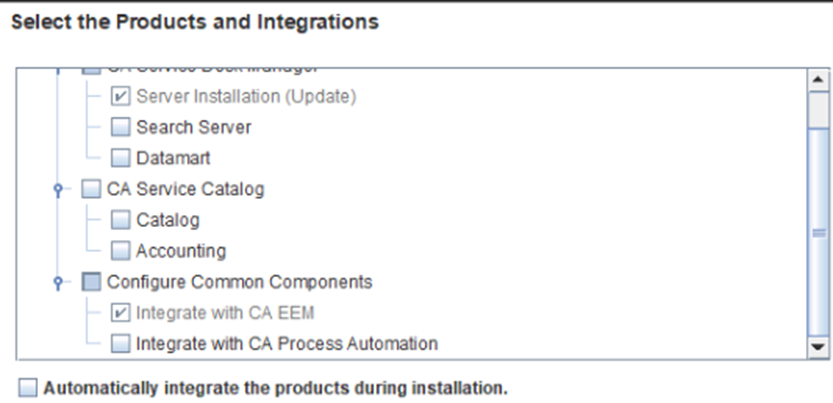 The install media, "CA SERVICE MANAGEMENT SD PACKAGE 17.4 FOR WINDOWS (WITH CATALOG).iso" is not only specific for installing/upgrading SDM but also for integrating with EEM and ITPAM if their information is existing in MDB already. i.e. If the MDB has the details of EEM and ITPAM already, the option cannot be deselected. So, complete the 17.4 GA upgrade/install with EEM and ITPAM details, and turn off the integration options as per below after the upgrade/install is completed successfully.