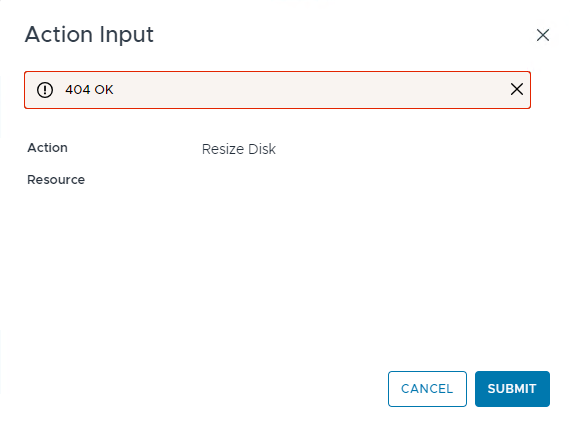 When a user tries to run Day 2 Actions against a resource in vRA Service Broker such as a Virtual Machine, they are faced with error "404 OK" as shown below: