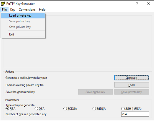 On the PuttyGen Key Generator, click on the menu File→Load private key