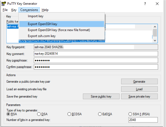 Now from the menu click on Conversions→Export OpenSSH key OR Conversions→Export OpenSSH key (force new file format)