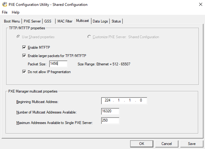 MTFTP performance may be configured by changing the Packet Size in the PXE Configuration.