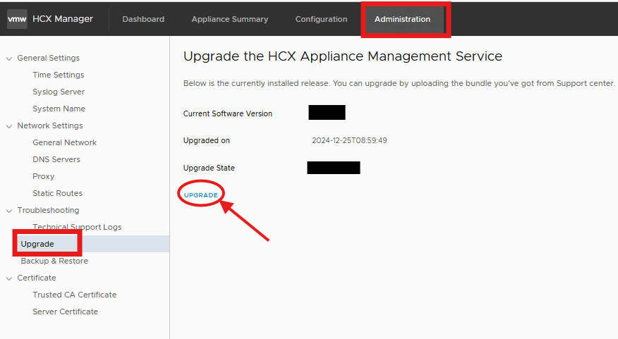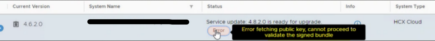 ovf_klnext.public from a working HCX Manager (of the same HCX version) to the /common/ks/ directory of the affected HCX Manager. https://<hcx-manager-ip-fqdn>:9443), navigate to Administration > Upgrade > Upgrade > Choose File > Select the HCX Upgrade bundle and then retry the upgrade.HCX upgrade bundle can be downloaded from the Broadcom Support Portal. Next to your profile on top right, click the dropdown and go to VMware Cloud Foundation -> My Downloads -> VMware HCX