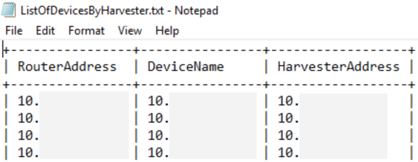 This will create a Text file with the Router IP address, Device Name and Harvester Address.