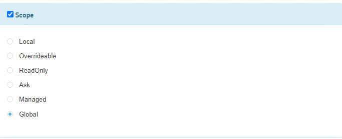 7. Change the scope with Global. The parameter value is changed globally for all Policy Servers (that do not have a local value override set) using the same policy store.