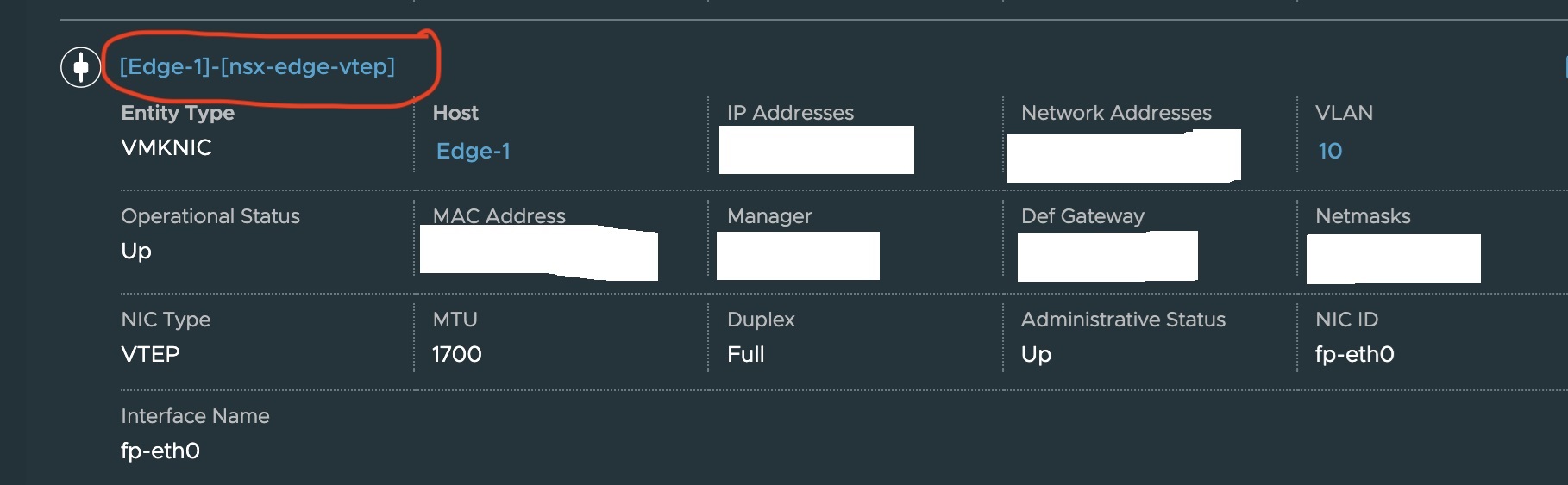 Based on design, VTEPs are modelled as VMKNIC where subtype is VTEPs. Here, the same physical interface fp-eth0/1 is used for overlay traffic as well as the VLAN traffic. Aria Operations for Networks created single interface for physical as well as for the vTEP