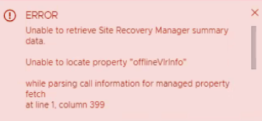 Dpxa agent running on either Site Recovery Manger appliance -or- vSphere Replication appliance is unable to retrieve "offlineVlrinfo" property on peer SRM or VRMS. This property was added as of version 9.0.2 and having 9.0.1 version in the environment will cause errors when dpxa agent performs checks against all connected sites