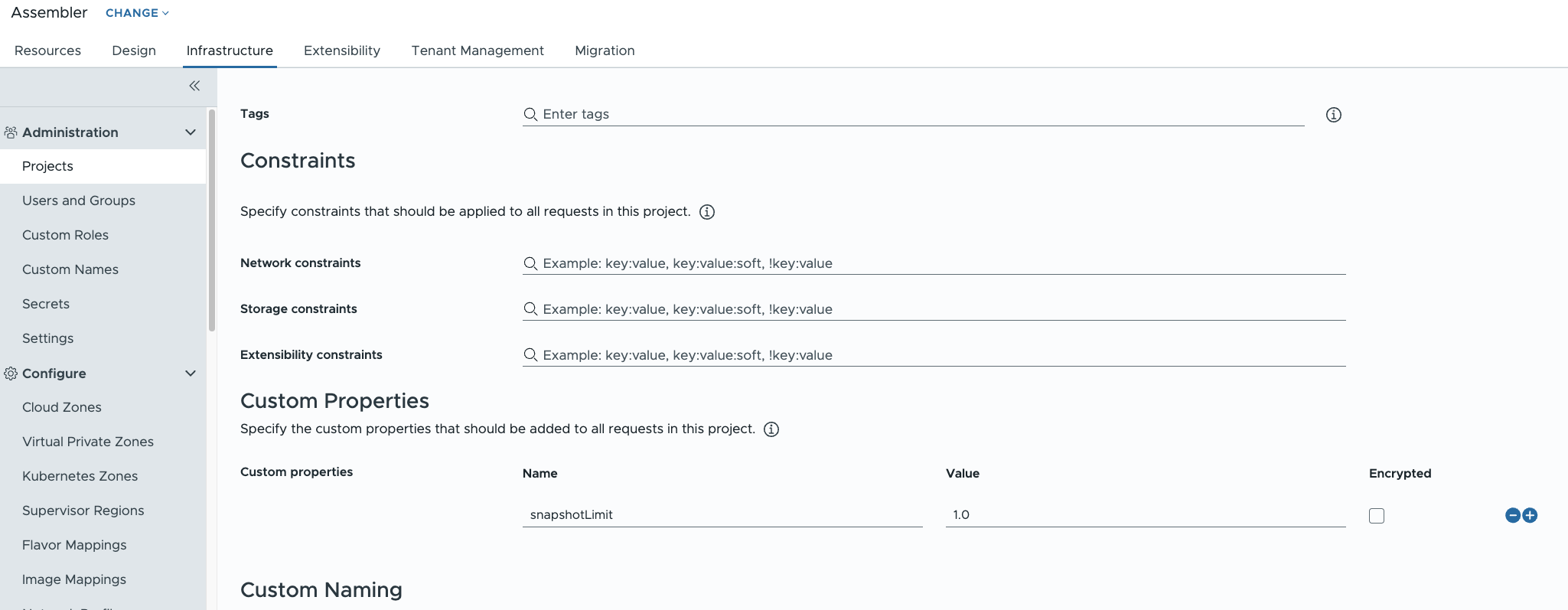 Add Disk day 2 action for the VM getting fail with ERROR: Internal Server Error when snapshotLimit is used as Custom property in the Project and assign the value as 1.0ERROR tango-blueprint [host='tango-blueprint-service-app-xxxxxx' thread='http-nio-8080-exec-47' user='catalog-8xxxxx(xxxx)' org='1beaa0b6-xxxxxxxxxxxx' blueprint='72f1f3ab-xxxx--xxxxxx' project='07abb1da-xxxxxxxxx' deployment='596bcac6-xxxxxxxxxxx' trace='505157c7-xxxxxxx'] com.vmware.tango.blueprint.exception.ControllerExceptionHandler - Runtime exception: class java.lang.String cannot be cast to class java.lang.Number (java.lang.String and java.lang.Number are in module java.base of loader 'bootstrap') [Error Reference ID: 1642cf3c-xxxxxxx] ClassCastException: class java.lang.String cannot be cast to class java.lang.Number (java.lang.String and java.lang.Number are in module java.base of loader 'bootstrap')