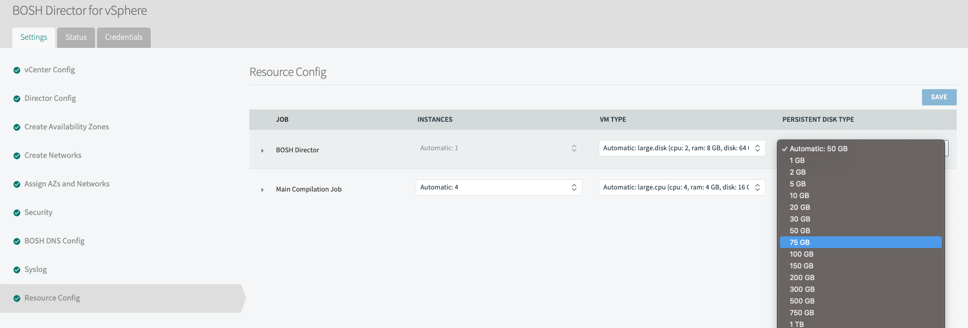 Modify the "bosh_persistent_disk_type" value to the size you need based on the available disk sizes from the drop-down menus on the BOSH Director Tile >> Resource Config >> Under Persistent Disk Type. This must be set in megabytes.