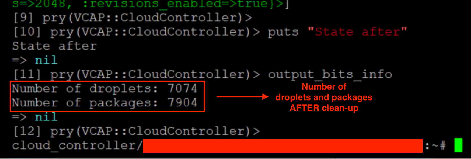 10. After pressing the 'q' key, we get this output seen in the image below. We notice that the total number of droplets and app packages has decreased down to 7,074 and 7,904. From step 7, we recall that the total number of droplets and app packages were 8,312 and 11,792. Because the number of droplets and packages has decreased, it is likely that we had a fair number of stale droplets and app packages.