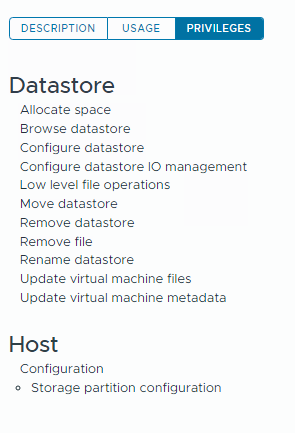 Custom role in vCenter has only all the privileges from the 'Datastore' segment.