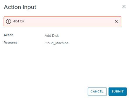 From the har file provided it can clearly be seen that this request is the problem:https://host/form-service/api/forms/renderer/model?formType=requestForm&isUpdateAction=false&formId=&projectId=<ID>&resourceId=<ID>&deploymentId=&sourceType=resource.action&sourceId=Cloud.vSphere.Machine.Compute.Disk.Resize{ "timestamp": "YYYY-MM-DDTHH:MM:SS.461+0000", "path": "/form-service/api/forms/renderer/model", "status": 404, "error": "Not Found", "message": "404 NOT_FOUND \"Failed to validate form source due to: \"; nested exception is org.springframework.web.server.ResponseStatusException: 404 NOT_FOUND", "requestId": "<ID>", "@type": "org.springframework.web.server.ResponseStatusException", "cause": { "message": "404 NOT_FOUND", "@type": "org.springframework.web.server.ResponseStatusException" }}