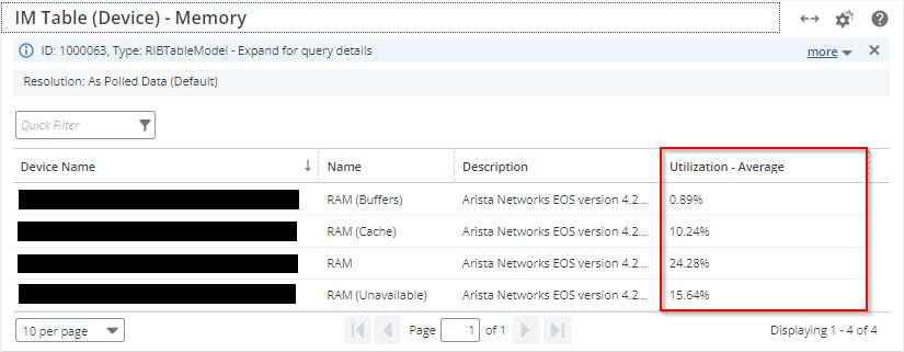 The Memory utilization for the Arista device displayed in Performance Management and Spectrum does not line up.