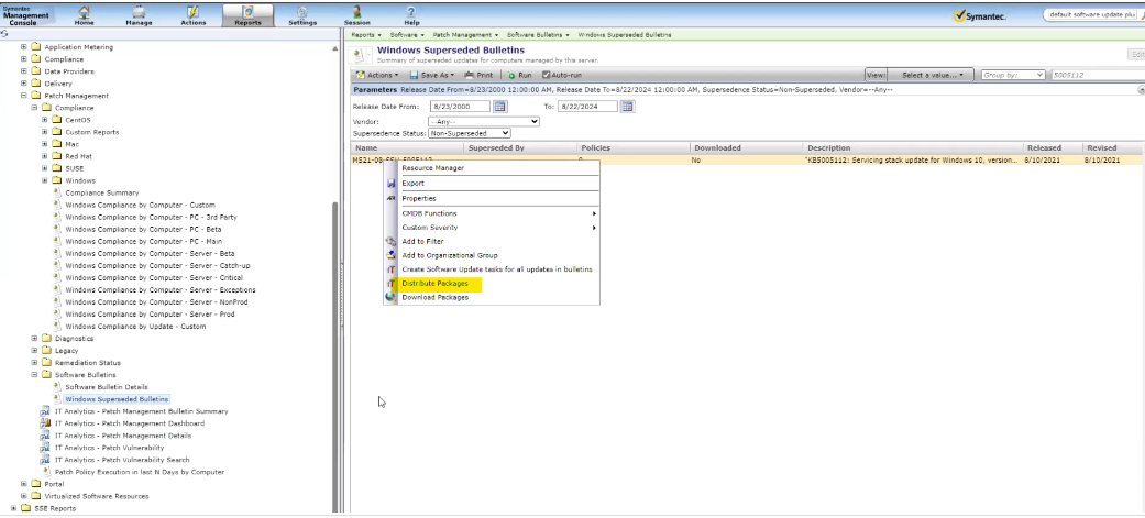 We ran the Compliance by Computer report setting the Release Date From parameter to the year 2000. We then reviewed the not installed updates (right-click an affected computer and choose this option) to see the missing updates. We found in this case that MS21-08-SSU-5005112 was missing. We created a SW update distribution policy with this update, and after deploying this update, MS24-08-W10-5041578 then showed in the compliance report for the affected servers, and we were then able to deploy and install the update.
