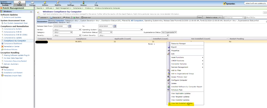 Look at the SMP Console and under "Compliance by Computer" report, find that this affected Windows Server under "View Not Installed Updates" had some Critical patches missing (we set the "Release Date From: 8/23/2000" and changed the "Supersedence Status: Not Superseded". In this case, it was missing one critical update: MS21-08-SSU-5005112.