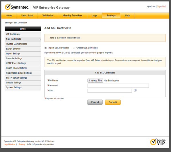 Importing newly created SSL certificate prompted "There's a problem with the Certificate" error in VIP EG, as below: