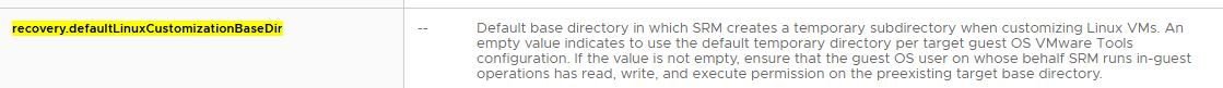 4 After confirming the directory /temp is at both sites is removed. Configure in Site Recovery for Advanced Settings the recovery.defaultLinuxCustomizationBaseDir with the directory to use for Recovery, the test recovery is a success. Check vSphere Client > > Site Recovery > OPEN Site Recovery > View Details > Site Pair > Advanced Settings > Recovery > EDIT > recovery.defaultLinuxCustomizationBaseDir make sure this is blank and uses /tmp on the Hosts, in this case added /temp.