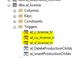 There are insert, update and delete triggers (screenshot below) on the al_license MDB table which were installed with CA SwCM (CA Software Compliance Manager) which has been end-of-life (EOL) a decade ago.