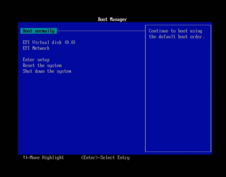 You deployed a new SpanVA OS into ESXi. However after starting up the VM, the OS is stuck at the boot manager screen: