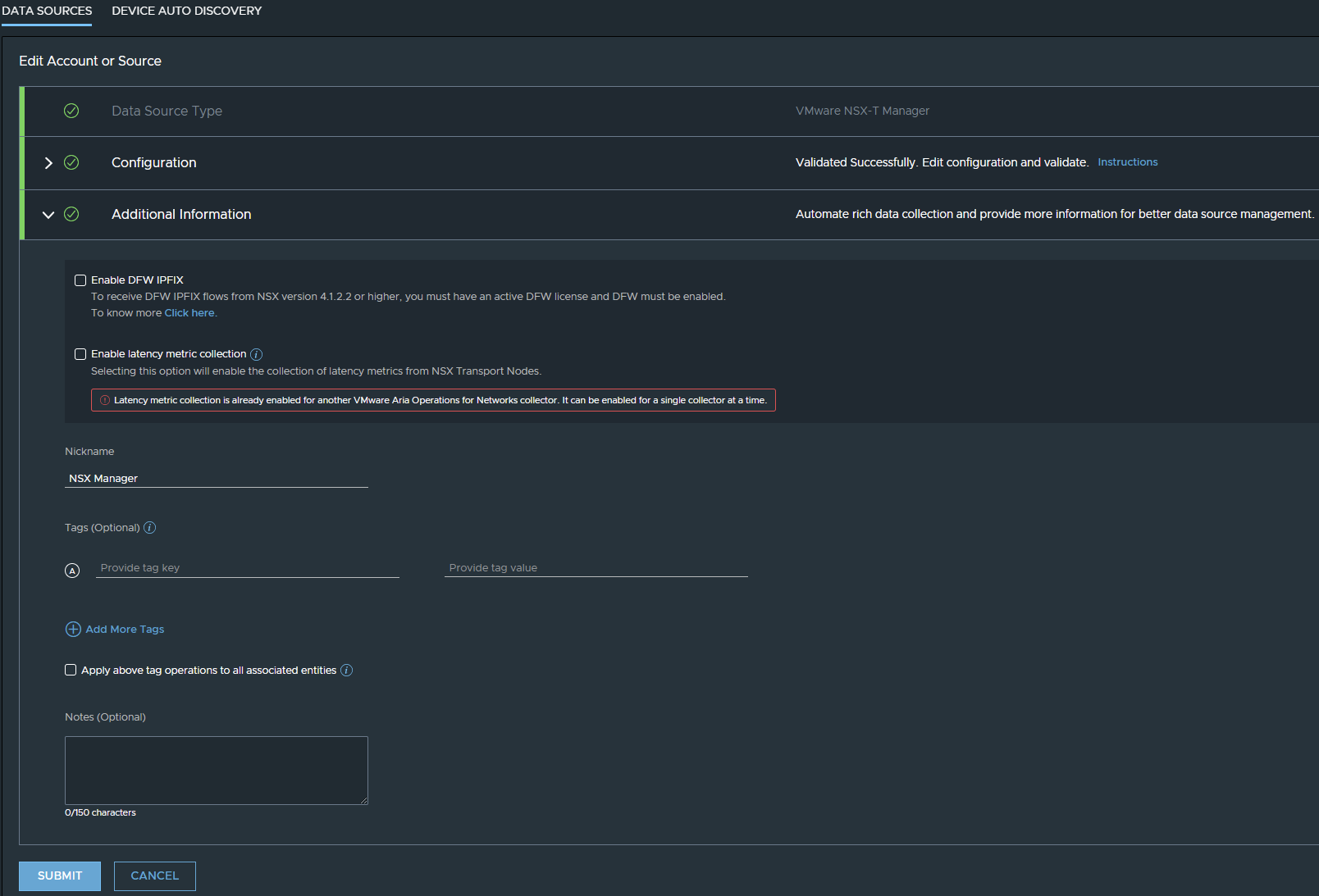 3. Wait for 5 minutes and enable NSXT Latency checkbox in Aria Operations for Networks GUI and Click Submit.