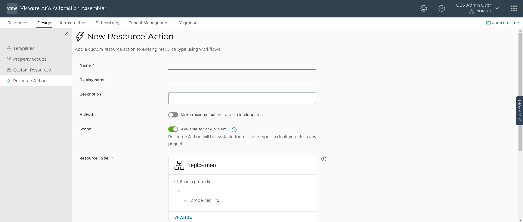 When navigating to Assembler -> Design -> Resource Actions properties for Deployment Resource Type in Cloud Assembly Resource Action are not visible: