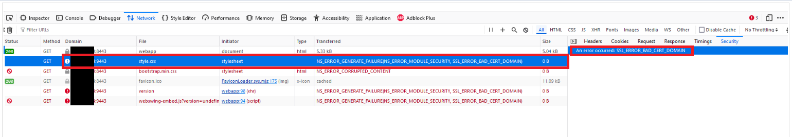 Using Firefox Developer Tools (from the Firefox menu select: Tools -> Web Developer -> Web Developer Tools), can see failure concerning SSL certificate not valid.