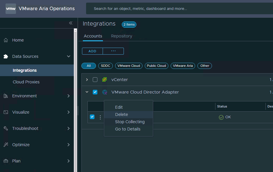 Click on Integration.Go to the connector for the vCD cell and deleted it, while saving historical data. See below screenshot: