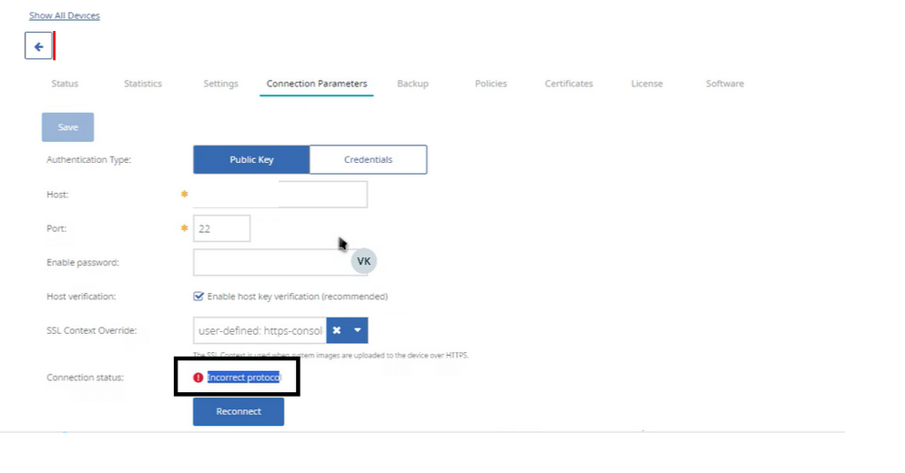 "Invalid Protocol" seen over the connection parameters on Symantec Management Center while setup a connection and trying to connect/reconnect