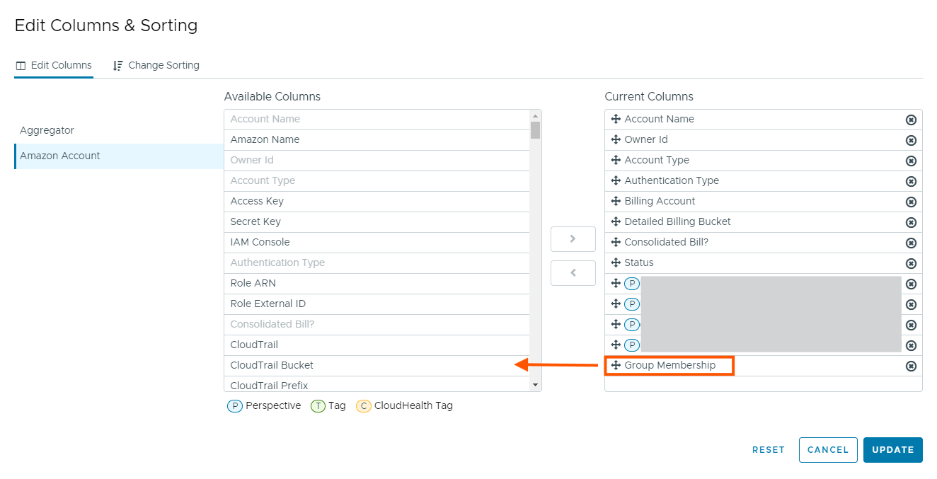 Check if the Group Membership columns is selected in the AWS Accounts page and remove from Current Columns: