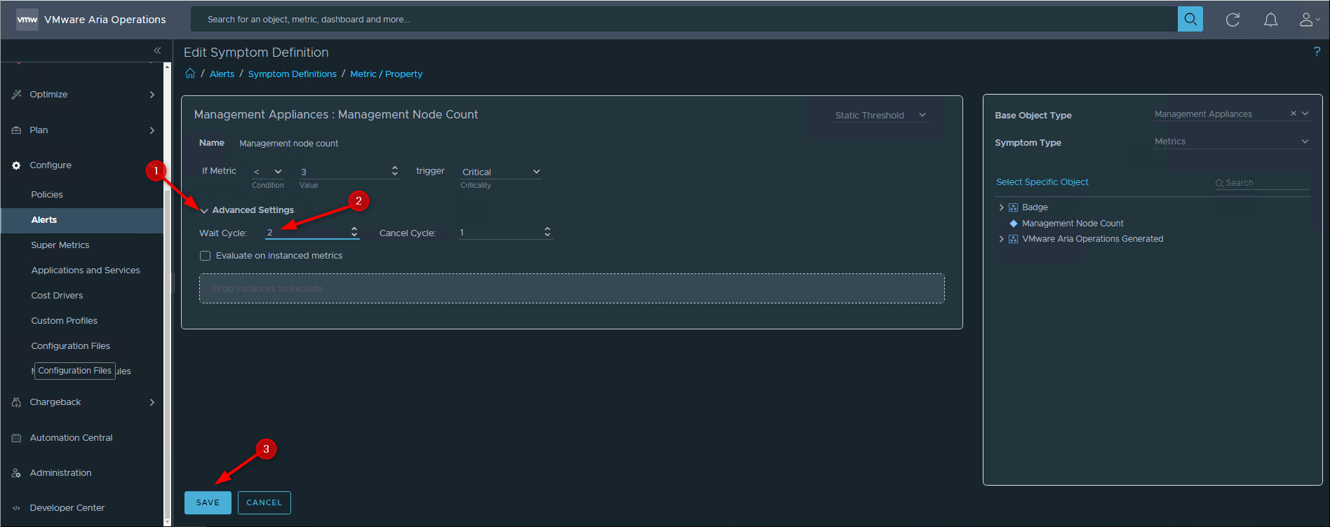 To resolve the false positive alert from triggering it is resolved by increasing the wait time from 1 to 2 on "The Critical symptom Management node count has been observed on: Management Node Count 0 < Threshold 3" as this will set the alert to wait 10 minutes which in the instances of the flapping occurring will prevent the alert from falsely triggering.