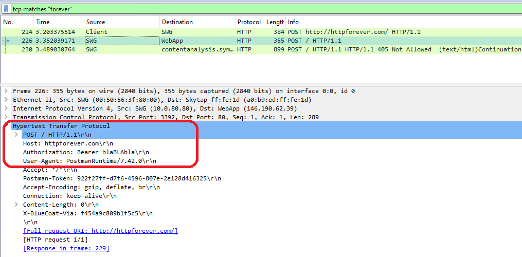 Clear-text HTTP website "http://httpforever.com/" can be used for testing to see the upstream dialogues (if via HTTPS it would be encrypted). Please do not carry out the same tests in production.