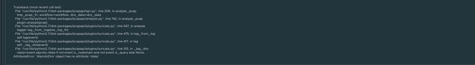 This is due to a known issue with pcapapi. It errors out whenever it has to deal with the analysis of a pcap contains DNS traffic.