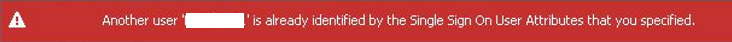 With SAML integration enabled the SSO User Attributes must be unique for every created user. The attributes are configured per user basis in the user configuration "Single Sign On Mapping" section. By default it contains the e-mail address but it may differ based on the integrated SAML service requirements. The error message that is displayed during the user creation points to the user name that already has the same information in the Single Sign On Mapping field.