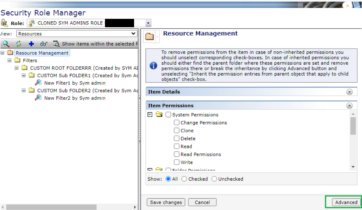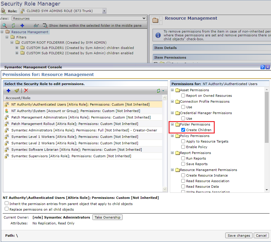 Login to SMP Console using account from cloned Symantec Administrators role > go to "Manage" > "Filters" > right-click on folder that has disabled "Create Children" folder permission > see result, you still can create items there but should not.