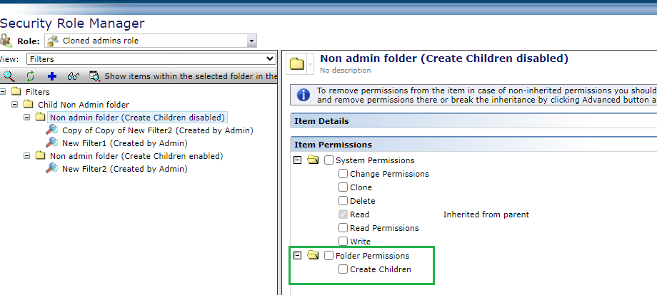 Open Security role manager for this cloned role > choose "Filters" in drop-down menu and remove all default enabled permissions from root "Filters" folder > save changes. Now click "+" and select there your custom root folder > click "OK" > now enable "Create Children" permission for one of sub-folders and one of sub-folders has disabled "Create Children" permission > save changes.