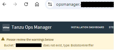In this case, the cause was a typo in the name of the S3 bucket listed as the storage location for droplets. A leading space was inserted in the name field at the beginning; this caused the configured bucket name not to match the actual bucket name. Carefully examining the warning as it appeared in Ops Manager reveals that the space is visible inside the initial quotes around the bucket name.