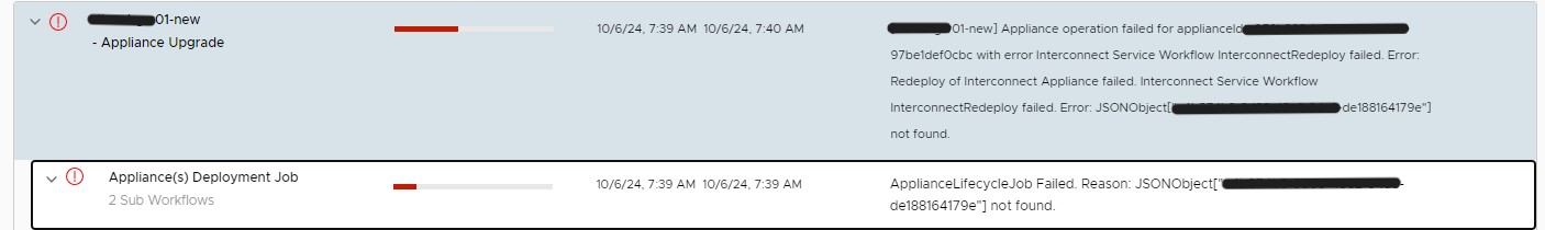 of Interconnect Appliance failed. Interconnect Service Workflow InterconnectRedeploy failed. Error: JSONObject["########-####-####-####-de188164179e] not found.. Retry attempt: 0.