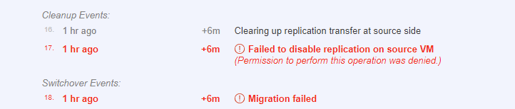 2024-10-03 20:00:00.121 UTC [VmotionService_SvcThread-1, Ent: HybridityAdmin, , TxId: ######-####-####-####-#######] ERROR c.v.h.s.v.j.StartSourceSideRelocateVmWorkflow- Source side relocate failed for the virtual machine. error is Permission to perform this operation was denied.