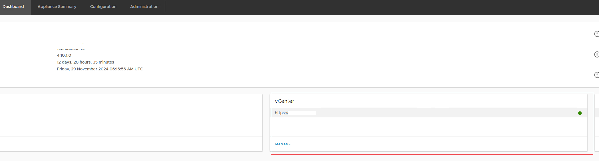 admin via https://<HCX-Manager-ip-or-FQDN>:9443, and verify vCenter connection status shows online under Dashboard Tab.https://<HCX-Manager-ip-or-FQDN>:9443, login as user admin, Goto --> Configuration Tab --> vCenter Server
