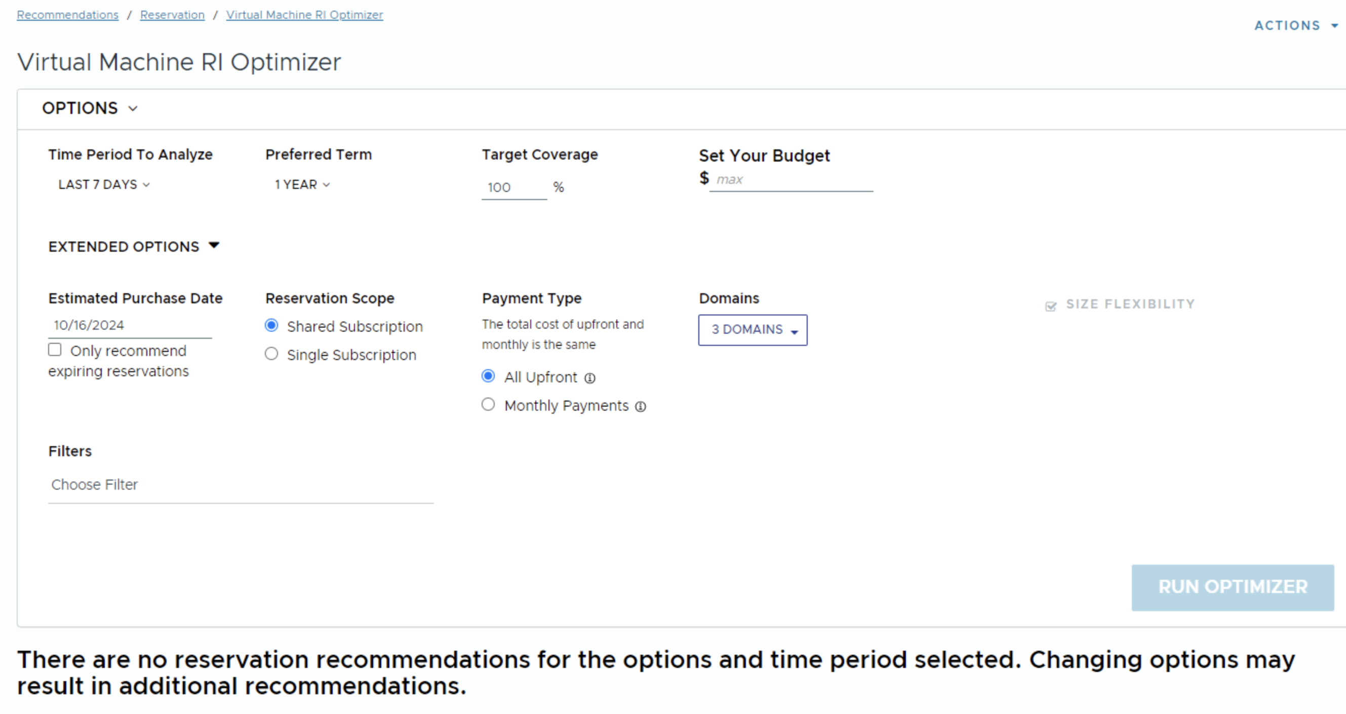 Virtual Machine RI Optimizer data not available for both 1Yr and 3Yr term .