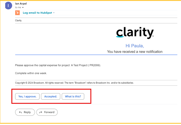 Actual Results: Action item notification in Clarity approvals buttons are different than what users see in email