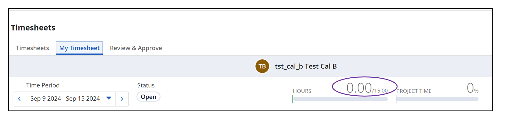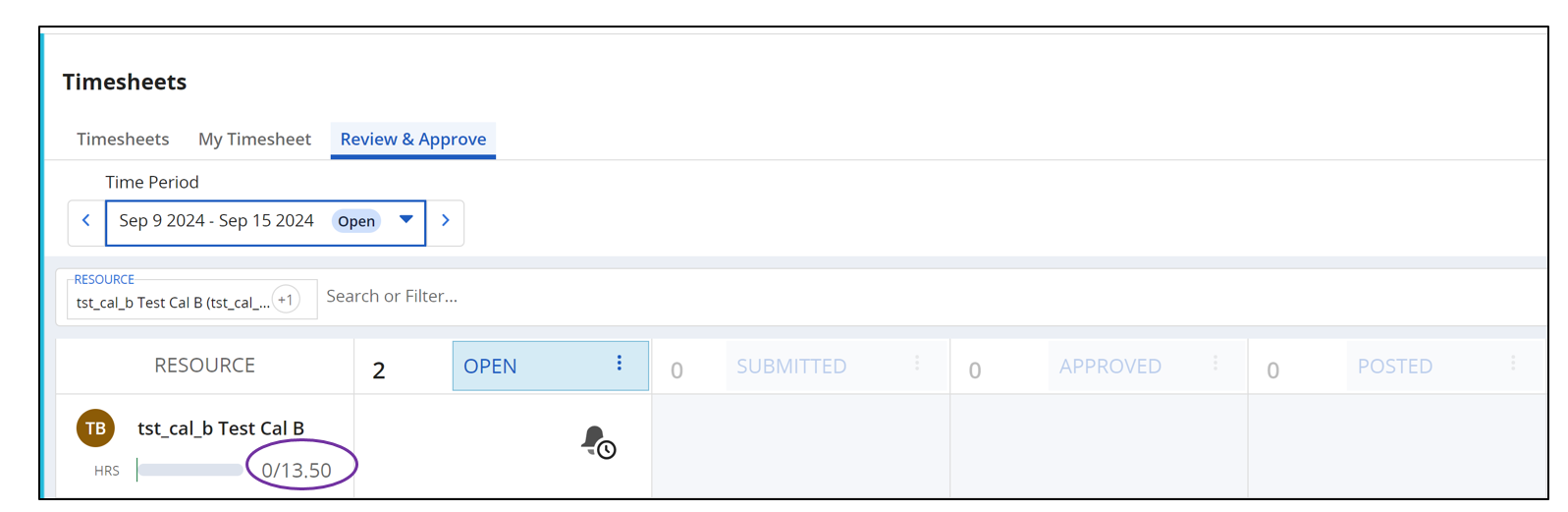 The available hours on Review and Approve should match with Timesheets tab and expected to be 15 hours as resoure is working for 2 days in that with 7.5 hours per day