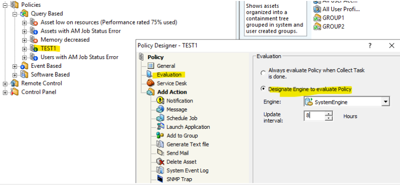 If a dynamic group or a "Query Based" policy has no Engine and frequency period set for the evaluation, it is evaluated very frequently (every time a Collect job is executed by one Engine).