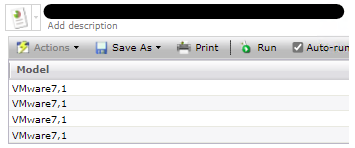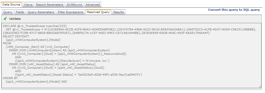 Created report in Report Builder to find distinct models of VMware computers with an asset status of 'active':